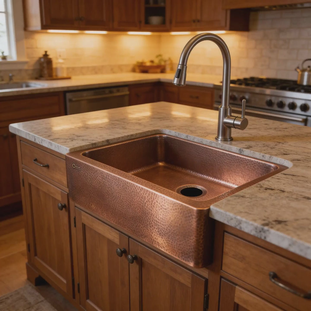 Copper Sink Hammered Front Apron 23.50 x 17.50 x 8 inch is a handcrafted copper kitchen sink made of Lead Free 16 Gauge Pure Copper. Front Apron Design: Hammered Finish:...